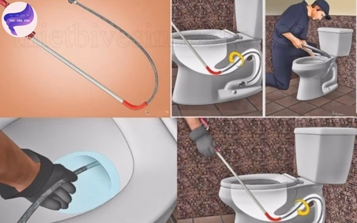 Cách thực hiện: đưa đầu dây lò xo vào bồn cầu và đẩy nhẹ nhàng đến khi gặp vật cản. Sau đó, quay tay cầm theo chiều kim đồng hồ để dây xuyên qua hoặc móc lấy dị vật, rồi kéo dây ra từ từ.