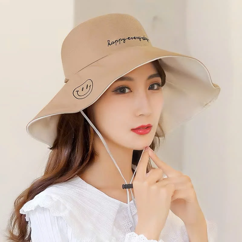 🔥 Mũ rộng vành bucket 2 mặt mặt cười kèm thêu chữ chống nắng cho bạn nữ đang giảm giá!